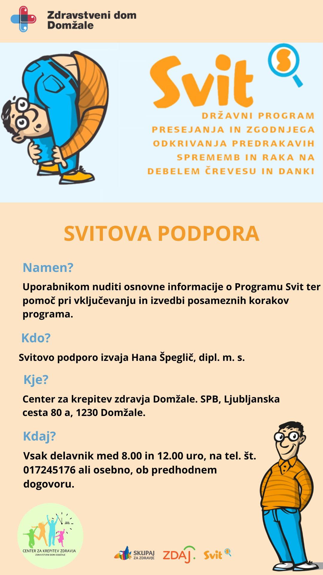 Svitovo podporo izvaja Hana Špeglič, dipl. m. s. vsak delavnik med 8.00 in 12.00 uro, na tel. št. 017245176 ali osebno, ob predhodnem dogovoru.