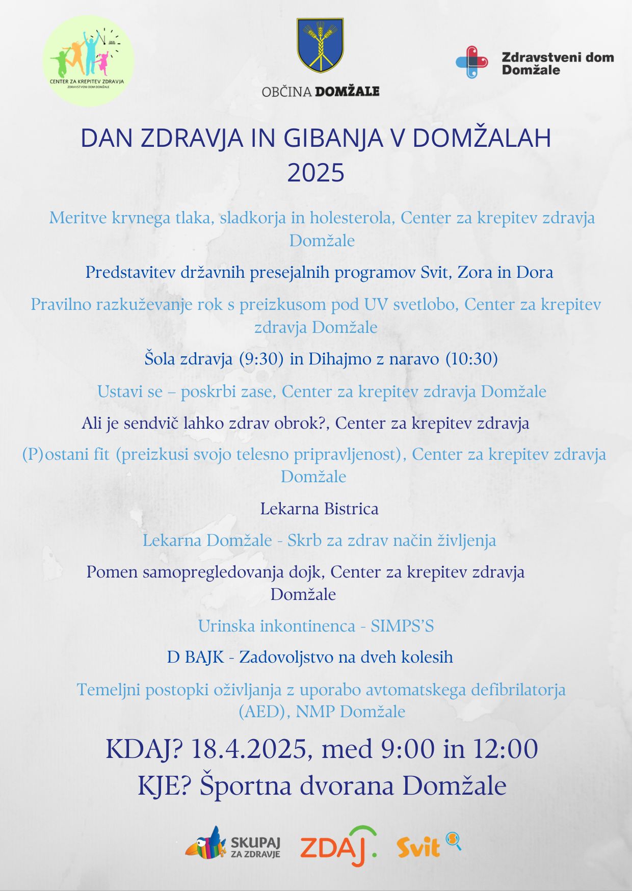 Vabimo vas, da se nam pridružite na Dnevu zdravja, ki ga vsako leto s pomočjo Občine Domžale, organiziramo v Domžalah (športna dvorana Domžale). Potekal bo v petek, 18. aprila 2025, med 9.00 in 12.00 uro.